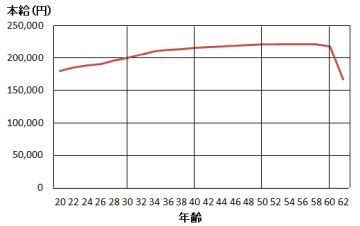 それを見ると、カーブの上昇は緩やかでピーク時の55歳のときでも本給は22万円程度、35年勤務して4万円しか上がりません。