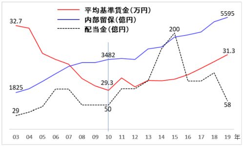 2004年に導入されたTARーGET(現行の処遇制度)の時も、経営状況が厳しいという理由でした。下のグラフを見ると、導入前年から2010年までの7年間に、内部留保も配当金も増えているのに、平均基準賃金だけが月額3.4万円もダウンしています。